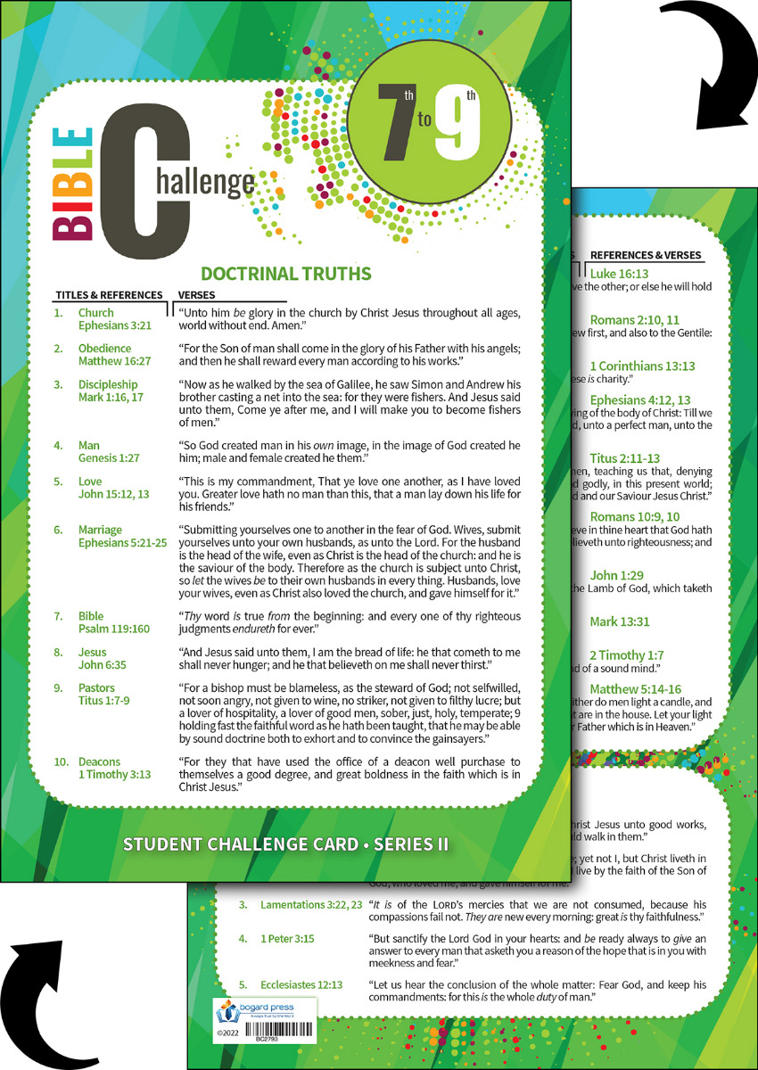 This is BIBLE CHALLENGE 7th TO 9th GRADE STUDENT CHALLENGE CARDS, Series II. Bible Challenge class time begins each week with a new lesson and game from the BIBLE CHALLENGE 7th TO 9th GRADE TEACHER BOOK, Series II. Each lessonβs topic is related to a Doctrinal Truth, a Bible Passage or a Bible Truth that students are learning for the week that are included on BIBLE CHALLENGE 7th TO 9th GRADE STUDENT CHALLENGE CARDS, Series II. Β The teacher will choose which lesson he would like to teach by choosing a Doctrinal truth, a Bible passage or a Bible truth from the challenge card and locating its corresponding lesson.