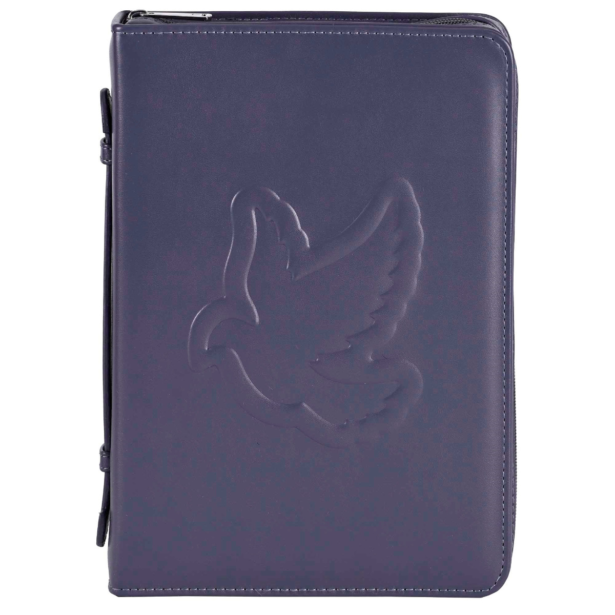 Gray Polyurethane Hard-Shell Bible Cover With An Embossed Dove On The Front. Features A Cross Zipper Pull, Lay-Flat Construction, An Elastic Pen Loop, Non-Rusting Self-Repairing Zipper and Nylon Reinforced Stitching. Also Has A Carrying Handle On The Spine.