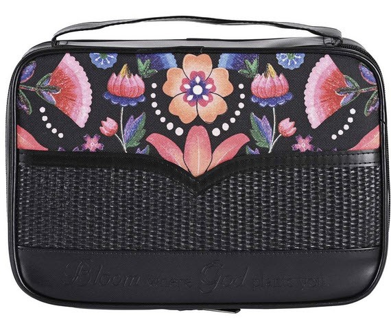- This black fabric bible cover is made of a sturdy 600 denier canvas-look polyester with nylon reinforced stitching; Non-rusting and self-repairing side zipper; Carrying handle at side; Cover lays completely flat when open; inside is a loop for your pen and an attached ribbon bookmark