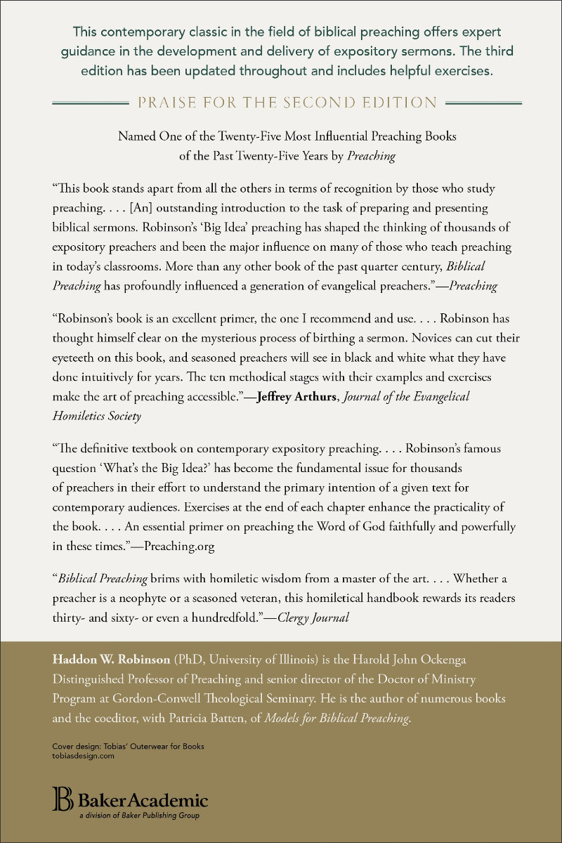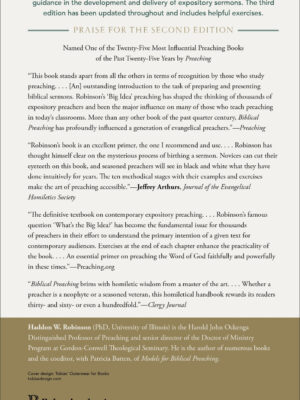 This bestselling text by Haddon Robinson, considered by many to be the “teacher of preachers,” has sold over 300,000 copies and is a contemporary classic in the field. It offers students, pastors, and Bible teachers expert guidance in the development and delivery of expository sermons. This new edition has been updated throughout and includes helpful exercises.