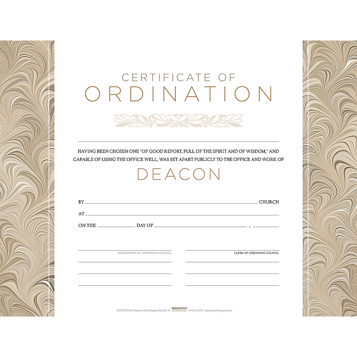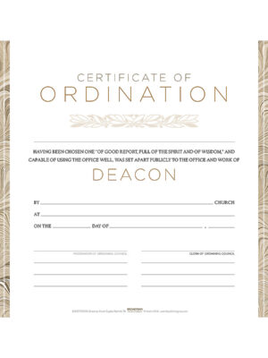 Deacon Ordination Certificate is printed on parchment look quality paper, with space to include Name, Date, Church, Clerk and Pastor.