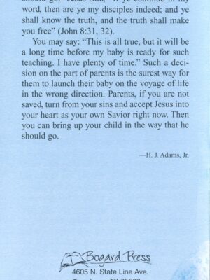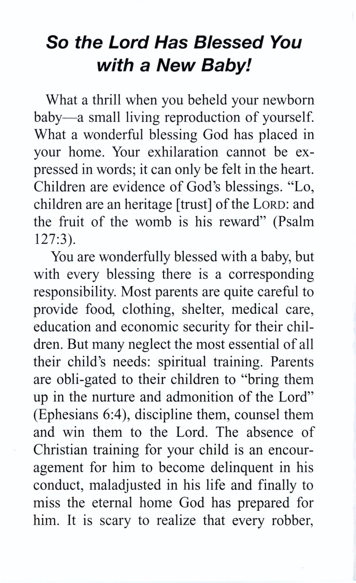This bi-fold tract encourages new parents in raising their new baby in the Lord. Using the Scriptures, the importance of raising children of God is connected to the importance of the gospel for the new parents. This tract is easy to add to a baby gift for parents of baby boys.