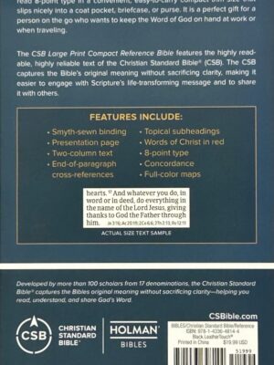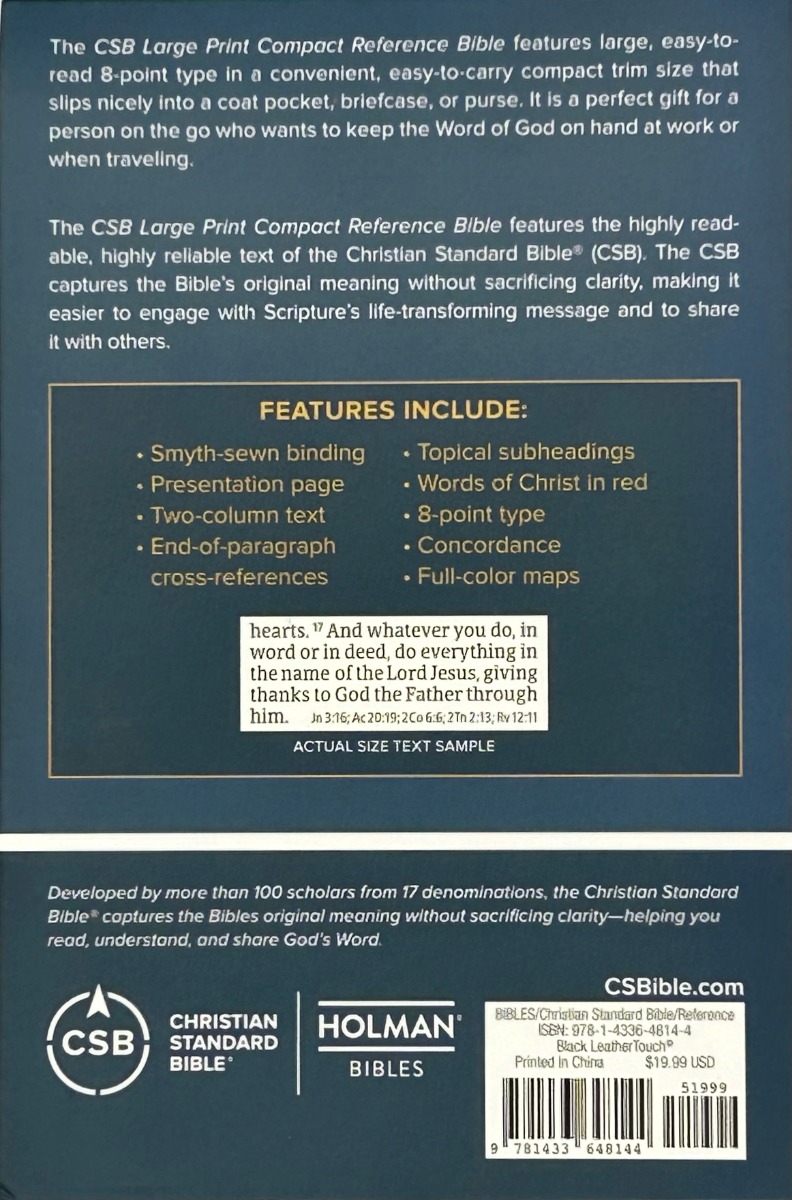 The CSB Large Print Compact Reference Bible features large, easy-to-read 8-point type in a convenient, easy-to-carry compact trim size that slips nicely into a coat pocket, briefcase, or purse. It is a perfect gift for a person on the go who wants to keep the Word of God on hand at work or when traveling.