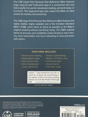 The CSB Large Print Personal Size Reference Bible features large, easy-to-read 11.25-point type in a convenient trim size that is perfect to use for devotional reading, personal study, or at church. The large-print type also makes this Bible an ideal choice for ministry and preaching.
