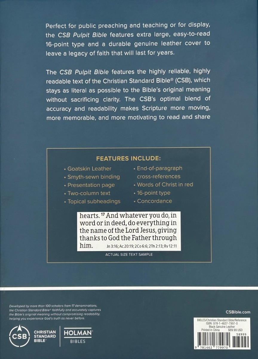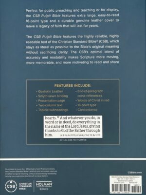 Perfect for public preaching and teaching or for display, the CSB Pulpit Bible features extra large, easy-to-read 16-point type and a durable genuine leather cover to leave a legacy of faith that will last for years.