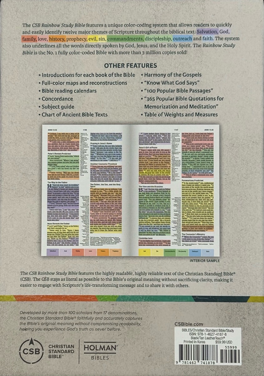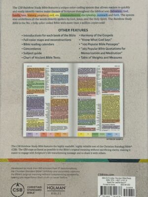 The CSB Rainbow Study Bible features a unique color-coding system that allows readers to quickly and easily identify twelve major themes of Scripture throughout the biblical text: Salvation, God, family, love, history, prophecy, evil, sin, commandments, discipleship, outreach, and faith. The system also underlines all the words directly spoken by God, Jesus, and the Holy Spirit. The Rainbow Study Bible is the No. 1 fully color-coded Bible with more than 3 million copies sold!