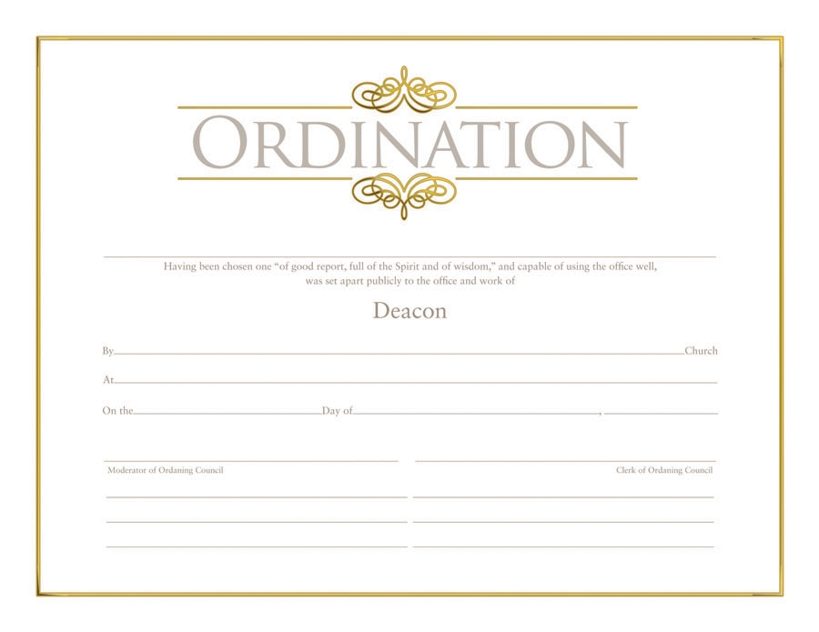 Deacon ordination certificate measures 8-1/2″ x 11″. Made from premium stock with gold foil embossing.