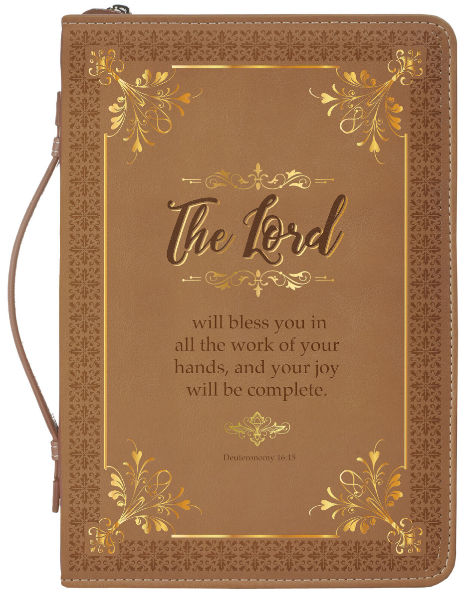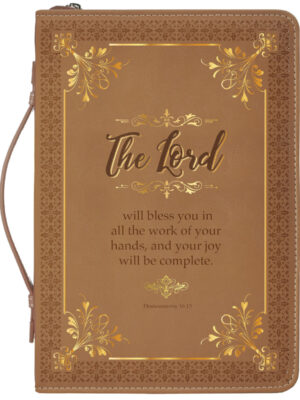 Bible cover in brown faux leather features gold embellishments with debossed border design and decorative typography Scripture verse, The Lord will bless you in all the work of your hands, and your joy will be complete. Deuteronomy 16:15.