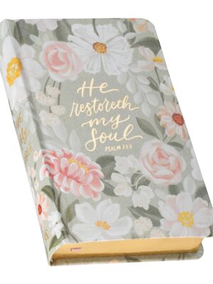 The Bible’s hardcover is wrapped in a beautiful lichen gray faux leather with soft blush pink and white flowers with golden centers that weave together with lush green foliage around the gold-foiled sentiment.