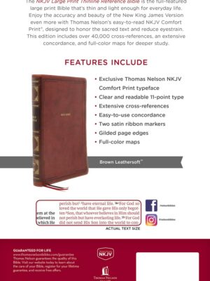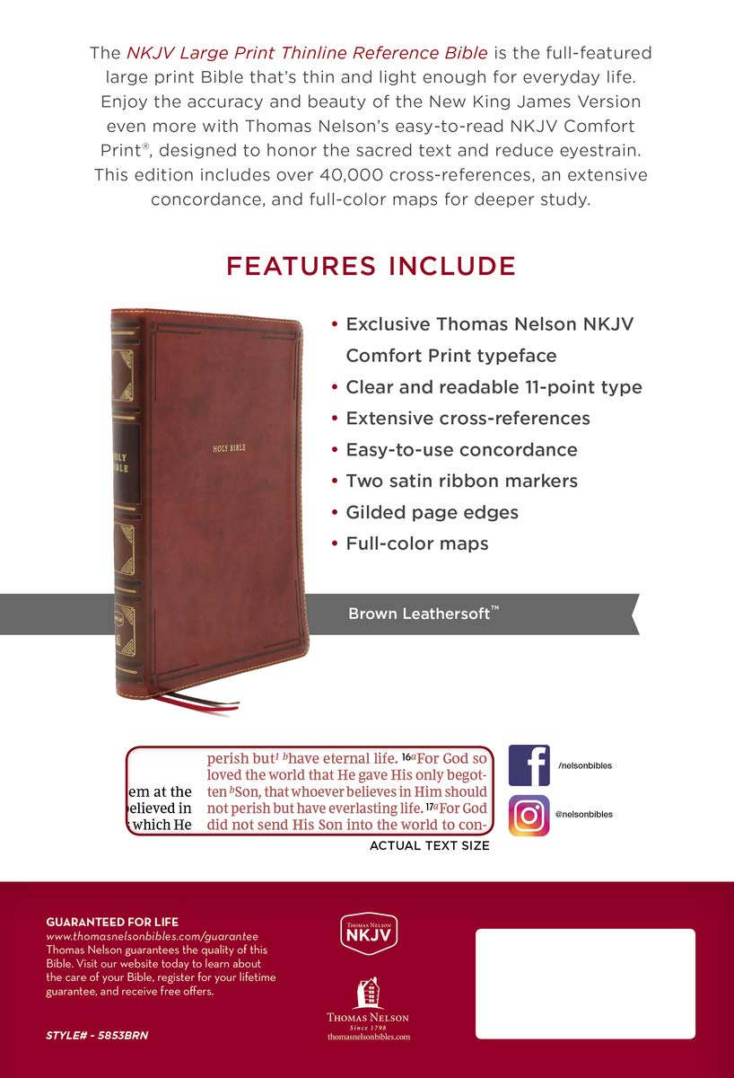 Thin enough to tuck into your purse or briefcase, this large-print reference Bible featuring Thomas Nelson’s NKJV Comfort Print typeface makes reading a pleasure, and the complete cross-reference system is the perfect study companion. The slim design of the NKJV Large Print Thinline Reference Bible means you can bring it along, wherever your day takes you. This large print edition features Thomas Nelson’s NKJV Comfort Print®, designed to provide a smooth reading experience of the accurate and beautiful New King James Version. And with features like a complete reference system, a concordance, and full-color maps, you’ll still have the tools to get more out of God’s Word.