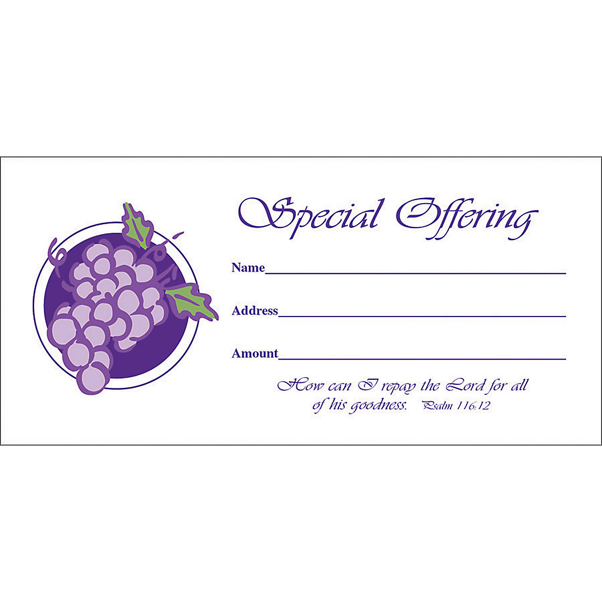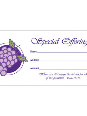 “Special offering envelopes are large enough to hold currency or a check without folding. Each envelope has space for name, address, amount given along with appropriate art and Scripture emphasizing the envelope’s particular use. Opens at top – Gummed flap – “Kwik Open” feature – 6 1/4″ x 3″ – Shrink-wrapped in packages of 100 – Psalm 116:12 NIV.