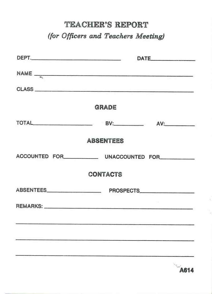 A report pad for officers and Sunday School teachers to use during meetings. 100 pages per pad.
