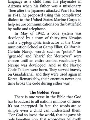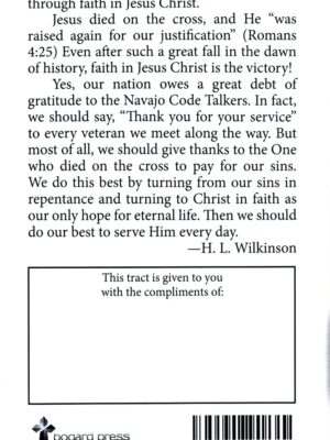 H. L. Wilkinson brings the gospel to the reader by looking at the Navajo Code Talkers then explains that the gospel is not encoded or encrypted. It is easy to understand! Wilkinson shares this gospel from the fall of man to redemption through Christ. An easy to read bi-fold tract makes for an easy to share message.