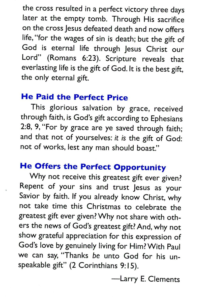 Larry Clements brings to the reader The Perfect Christmas Gift in showing how Jesus is the way to salvation. Using the Scriptures, Clements shows how Jesus came at the perfect time and paid the perfect price. Jesus now offers the reader the perfect opportunity. A simple bi-fold tract makes it easy to share the best Christmas gift of all, Jesus Christ.