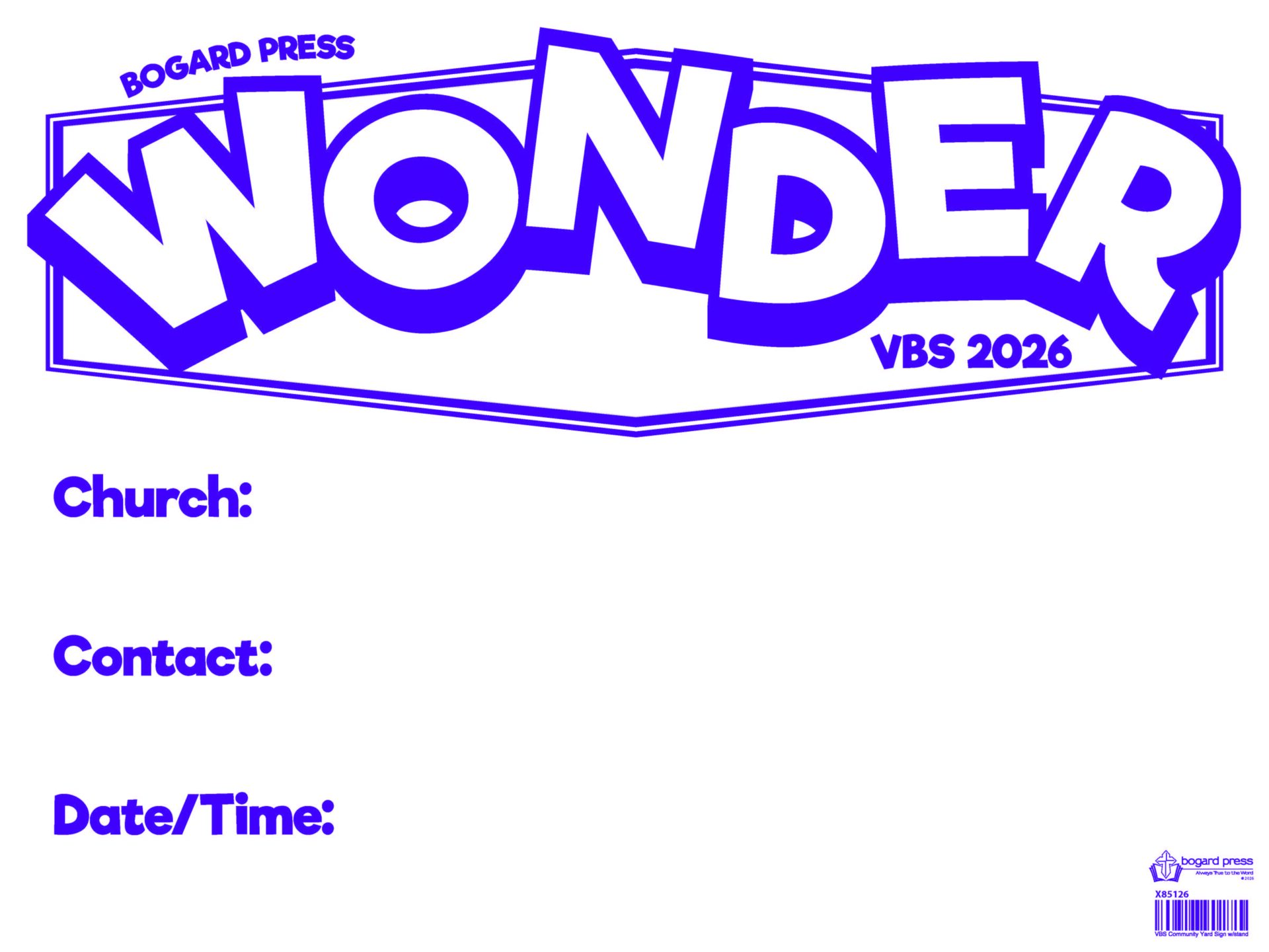 Spread the word about your Wonder VBS with this 24″ × 20″ two-sided corrugated yard sign. Includes metal stake. NOT INCLUDED IN THE SAMPLE KIT Nonreturnable Item LIMITED QUANTITY