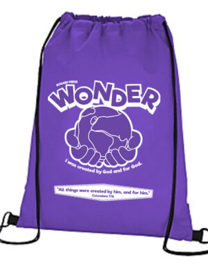Show others you were at VBS. The backpack is 16.5″ × 13″ made of purple non-woven polypropylene fabric with Wonder VBS logo on the front. NOT INCLUDED IN THE SAMPLE KIT Nonreturnable Item LIMITED QUANTITY