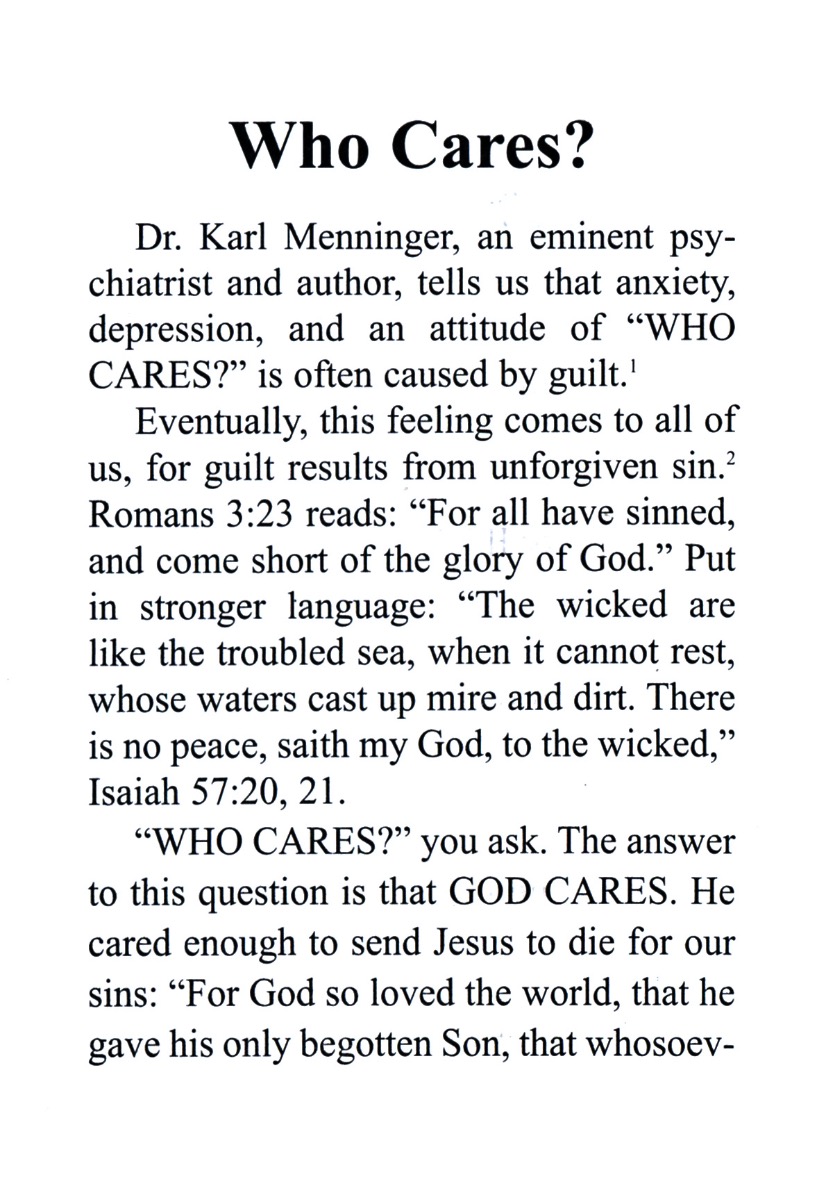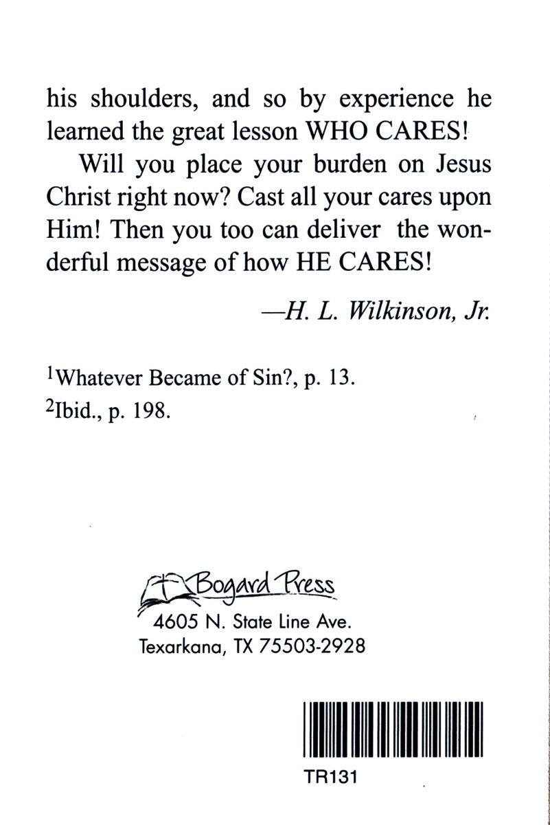 H. L. Wilkinson, Jr. shows the reader that God cares for him in this simple tract asking the question Who Cares? This little tract is full of hope for all. It shows that not only did God care enough to send Christ, He also cares enough to take on our burdens today. Show those around you how much you care by sharing with them how much God cares.